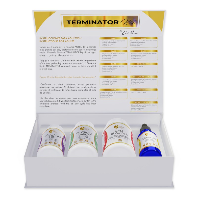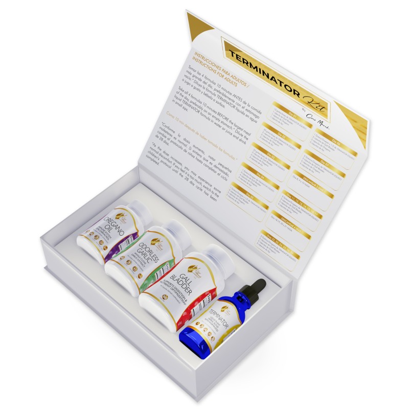 Este Kit está compuesto por cuatro fórmulas de alta concentración y poder reparador. Terminator líquido, Ajo Añejo Concentrado, Orégano con alta concentración de Carvacrol y mi fórmula exclusiva para la vesícula biliar.