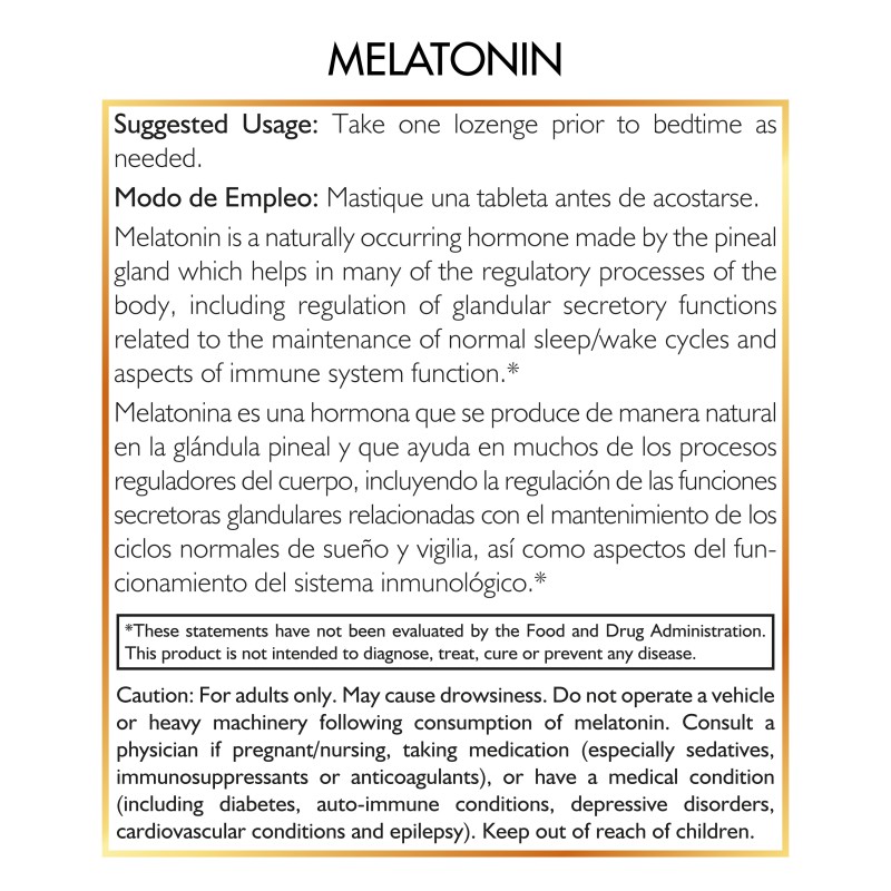 Precaución: Sólo para adultos. Puede causar somnolencia. No opere un vehículo o maquinaria pesada después del consumo de melatonina. Consulte a un médico si está embarazada/amamantando, tomando medicamentos (especialmente sedantes, inmunosupresores o anticoagulantes) o si tiene una condición médica (que incluye diabetes, afecciones autoinmunes, trastornos depresivos, afecciones cardiovasculares y epilepsia). Mantener fuera del alcance de los niños.