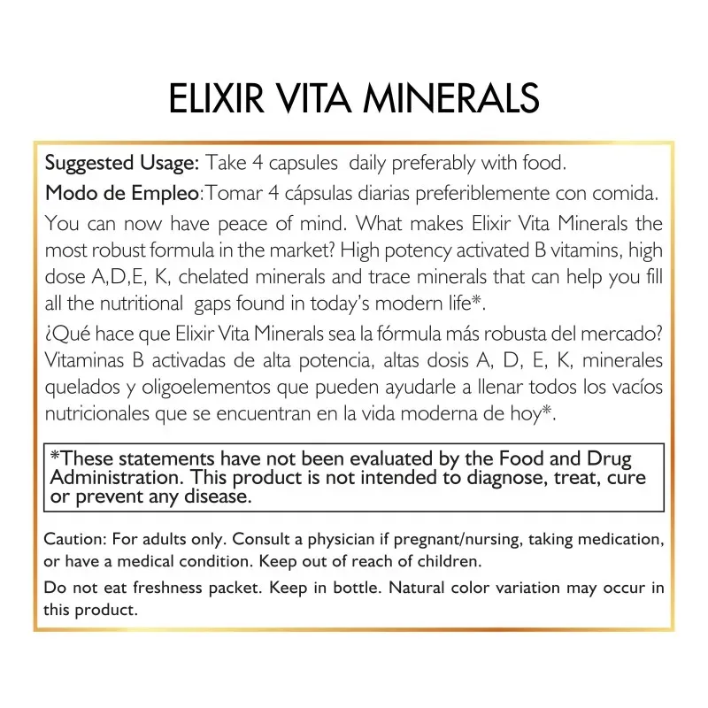 Precaución: Sólo para adultos. Consulte al médico si está embarazada/amamantando, tomando medicamentos o si tiene una condición médica. Mantener fuera del alcance de los niños. Mantener en botella. Puede ocurrir una variación de color natural en este producto.