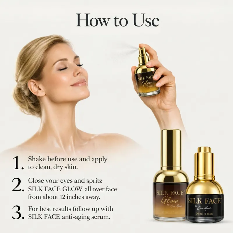 - Cierre los ojos y rocíe SILK FACE GLOW® por todo el rostro a una distancia aproximada de 12 pulgadas.