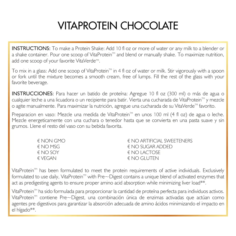 Instrucciones: Para hacer un batido de proteína, agregue 10 fl oz (300 ml) o más de agua o cualquier leche a una licuadora o un recipiente para batir. Vierta una cucharada y mezcle o agite manualmente. Para maximizar la nutrición, agregue una cucharada de su VitaVerde Favorito.